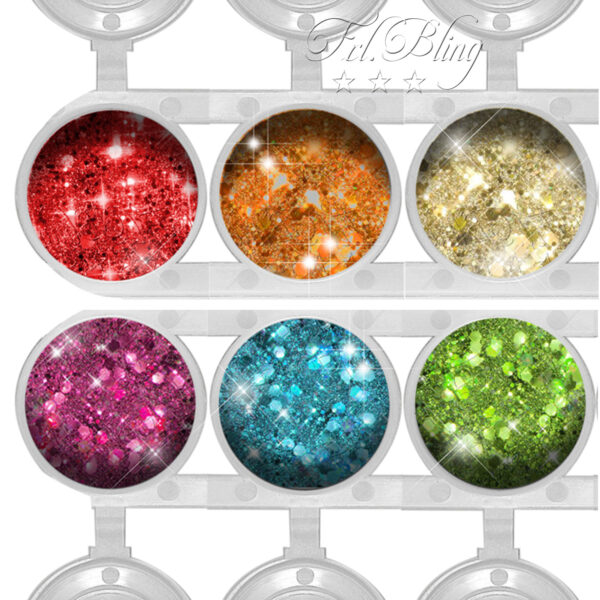 6 x 15 ml Chunky Glitzer in kosmetischer Qualität.